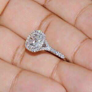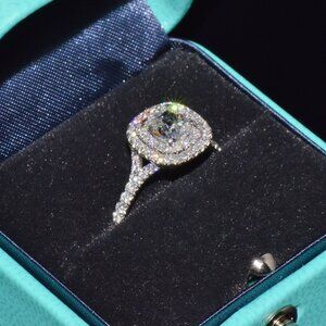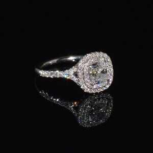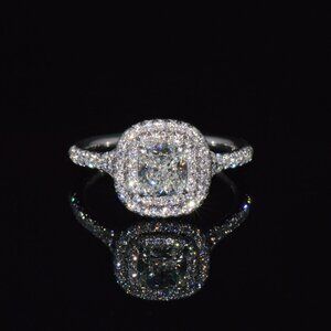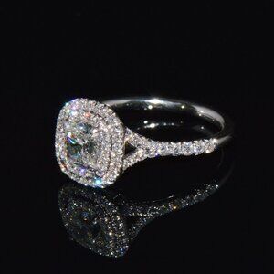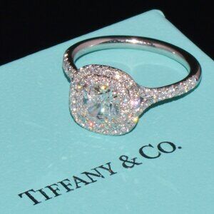 Genuine Tiffany & Co. Soleste 950 solid platinum 1.30CTS diamond ring. This gorgeous double halo engagement ring features a large 0.93CT natural G color / VS1 clarity / EX EX EX cushion cut diamond in center. The center diamond is surrounded with VVS-VS clarity F-G color round brilliant cut diamonds throughout adding up to 0.37CTS. This ring is made in solid 950 platinum.