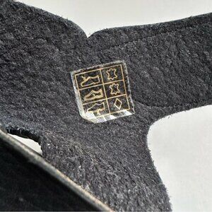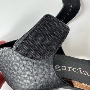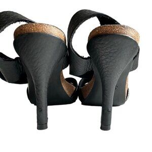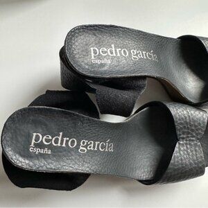 These gorgeous Pedro Garcia black pebbled leather sandals offer a sexy style while providing a very comfortable fit. The soft pebbled leather hugs the foot while the high quality VELCRO ® ankle straps are nice and wide and provide support and ease for putting them on and taking them off. The heel is not too high at 4 inches (+ 1/4 inch cork) and the footbed has a 3/4 inch cork platform and barely worn rubber soles that are non-slip. These shoes are lightweight, comfortable and flirty. You'll find yourself reaching for them for daytime to evening and they can be effortlessly dressed up or down. Very minimal signs of wear on these shoes aside from a few nicks/scratches pictured on the leather of the heels, but otherwise in great condition.