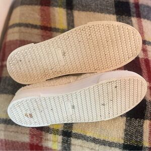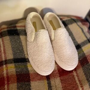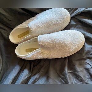 Ladies- Ivory colored mules/ clogs. Cloth type fabric. Sneaker shape.