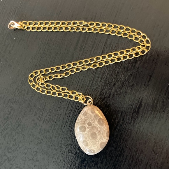 Beautifully Handmade Petoskey stone pendant with gold tone 20” chain necklace and Lobster clasp closure.