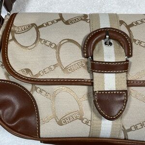 Slightly used Chaps tan patterned purse with brown accents. It has a snap closure in the front under a buckle. It has 1 zippered pocket & 2 open pockets inside. The strap is tan & white striped.