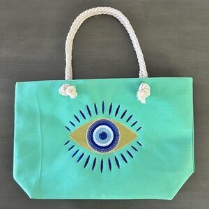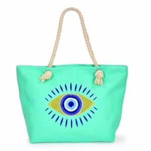 Evil Eye Green Aqua Gold Metallic Embroidered Protection Bohemian 22" Tote Bag