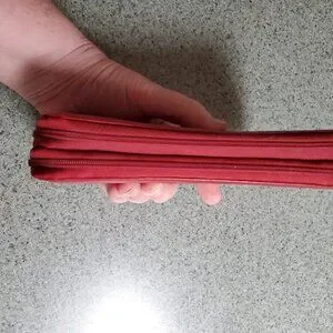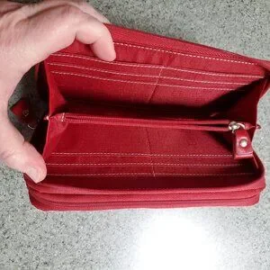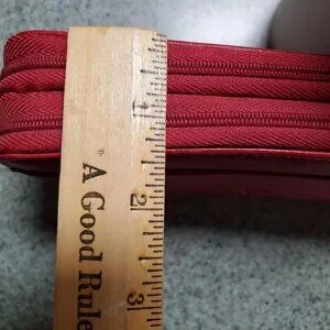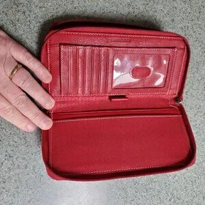 Beautiful deep red leather Stone Mountain ladies Wallet. There is a pouch on each side of the wallet and 2 zippered closures. There is plenty of space of cards, monies and zippered pouch for coins. Approximately 1.5 inches deep, 8 inches wide and 3.5 inches long.