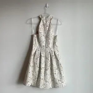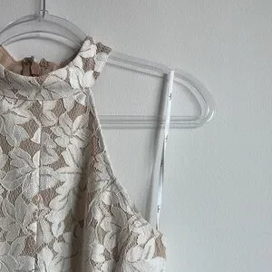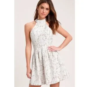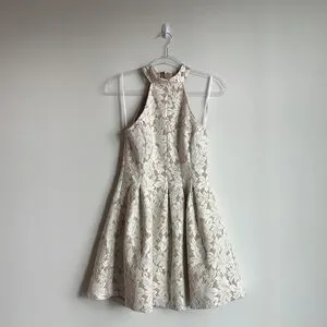 Nude & White Lace High Halter Neck Pleated Flared Skater Dress - Zipper Down Back