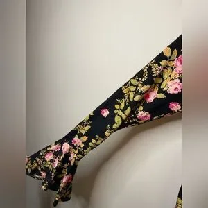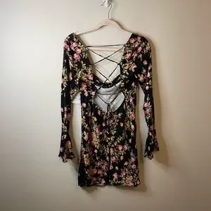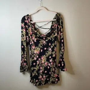 “Femme and floral, this essential mini dress features a cowl-inspired neckline and belle-style sleeves with lace-up detail at back for added dimension.