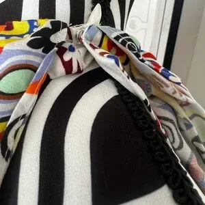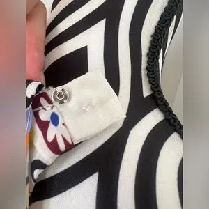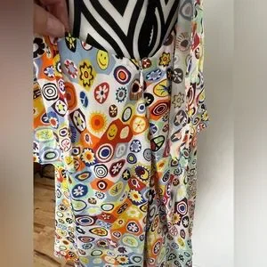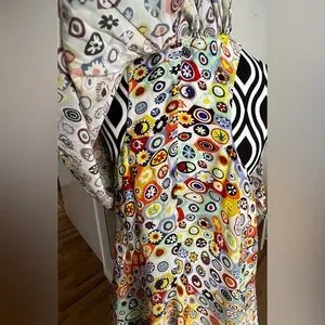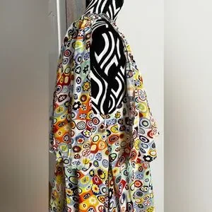 Super cute! It is missing a button at neck, but seems easy to fix. Perfect condition otherwise. Gorgeous print with peace signs, smiley faces, flowers, star etc. side zip and one shoulder is out and cape like neck area. Let me know if you have any questions. 86% viscose 14% polyester. Labeled as a sample on tag