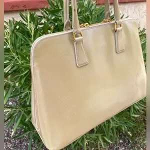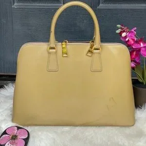 Auth PRADA Beige Saffiano Patent Leather Large Promenade Satchel