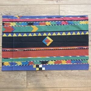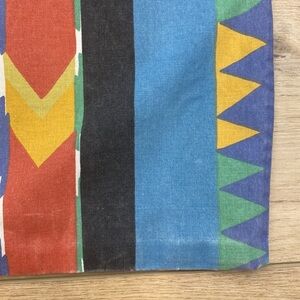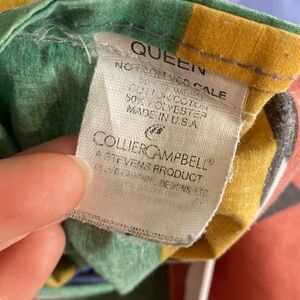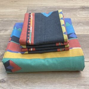 Bright Memphis southwestern 80’s vintage Collier Campbell Teton Print Queen size no iron percale Duvet cover and matching pillowcases. The duvet has a zipper closure and the set includes 4 matching standard pillowcases. Rare and unique boho bedroom set. General wash fading throughout and two spots where the outside stitch has separated (the inside stitch is still good, it is not a hole) overall good vintage condition.
