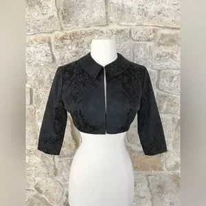The only tags are AFL-CIO union label and a Size 9 label in the dress. The label in the bolero is falling apart, but I think it says “Lot” and Size 9. Please remember this is vintage, and it runs MUCH smaller than modern size 9! It is an XS based on the waist of the dress
