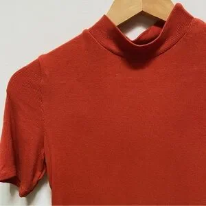Red/orange ribbed knit mock neck top. Retails for $20 on Amazon.