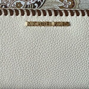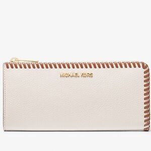 A compact accessory with outsize style, this eye-catching wallet is perfect for days that require on-the-go ease. Crafted from rich pebbled leather with whipstitched trim, its slim silhouette partially unzips to reveal multiple card slots and a sleek center compartment. Slip it into the coordinating tote. Comes with a Michael Kors care card.