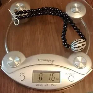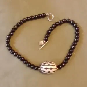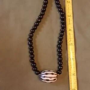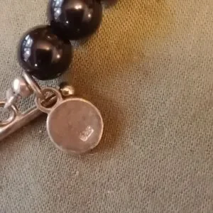 beautiful pre-owned silver clasp , hang tag stamped.925 on back with maker on front 'MA' or 'AM' , not sure what white- black bead is porcelain maybe, or who maker is but lovely with weight