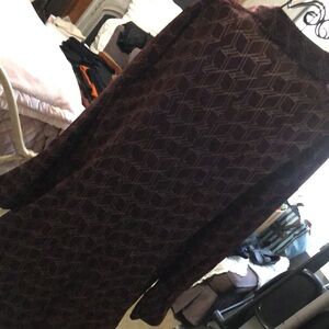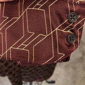 This is a beautiful silky Shirt, dress, button down, abstract, design with button cuffs, gorgeous missing one button, but easy to take one from the bottom hem Burgundy and cream color