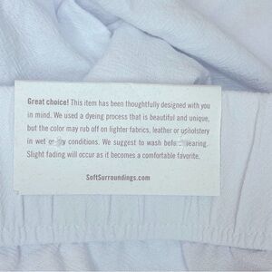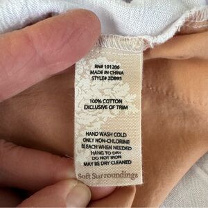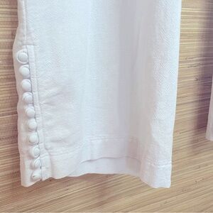 Wide leg pull-on pants from Soft Surroundings in a crop style. Elastic waistband. On-seam side pockets and 2 patch pockets on rear. The cute highlight of the pants is the row of covered buttons detail on each pant leg bottom side. Extra buttons included. Unlined.