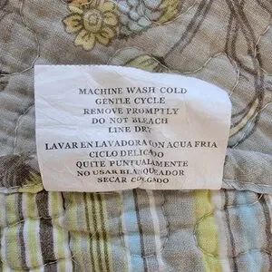 Quilt is reversible. Happy to answer any questions. No name tag. The gray is a warm gray not cool.With shipping thus will be between 5 and 6 lbs.