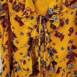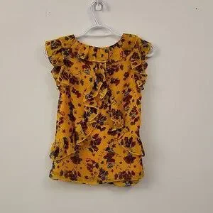 Rebecca Minkoff XXS ruffled short sleeve tie front yellow floral print blouse