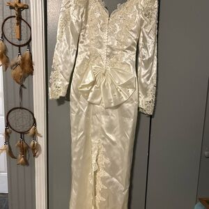 Off white lace wedding dress with beading. Padded long sleeves with buttons. Split in the back. Detachable train. (Dress altered to a size 6)