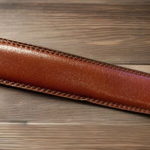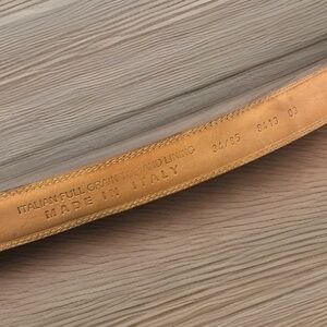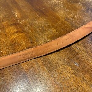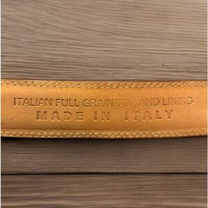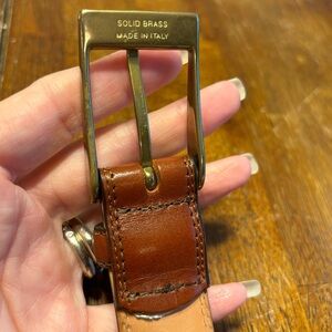 Very nice leather belt with solid brass buckle. Warm reddish brown leather. Size 34/85, made in Italy. Unbranded. In very good condition. Only one small imperfection as shown in the pictures. Smoke free, pet friendly home. Reasonable offers accepted.