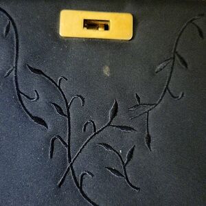 Previously Loved small evening bag with lovely detailed fine embroidery. Detachable strap gives you the option of shoulder bag or clutch. Interesting gold latch closure. Unfortunately there is a very small smudge just under the latch (see photo). other then that it's in like new condition...only used in photo shoots. One zippered pocket inside.