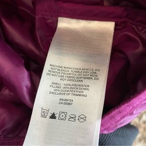 This is a girls Columbia jacket. Color is purple. Size 14/16. Pretty light but filled with duck down.
