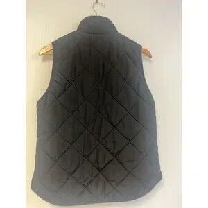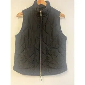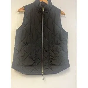 Introducing the J.Crew Mercantile quilted puffer vest, a stylish and eco-friendly addition to your wardrobe. This vest is made with polyester outer shell material and lined with polyester, featuring a solid pattern and short jacket/coat length. It comes in black color and has a zip closure, with accents of quilted design.