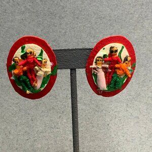Handmade, retro vintage worry doll oval shaped earrings with red background! Adorably imperfect!