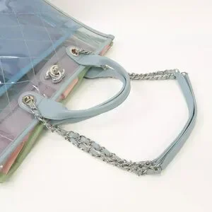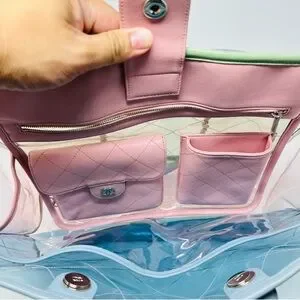 Chanel Coco Splash Shopping Tote features Quilted PVC. The bag is multicolored and the edges are trimmed with lambskin leather. In the inside are two pouches made of lambskin attached to the bag. Handle drop 4.5β, shoulder drop 12.5β. Collection #25, 2018. The item is in excellent condition. It come with the hologram and the original dustcover.