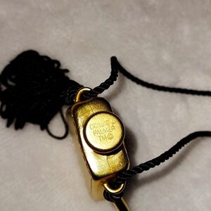 vintage and rare Debbie J Palmer Flaçon refillable perfume pendant on long black cord with pretty tussle. gold plated