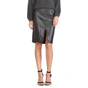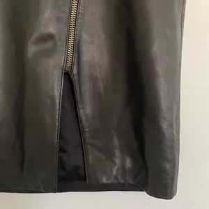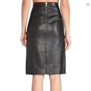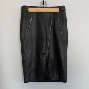 Leather pencil skirt with 2 front pockets, slanted front zipper with small slit, and back zipper.