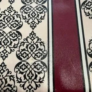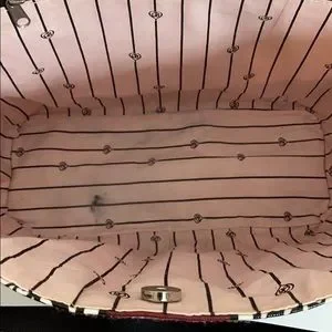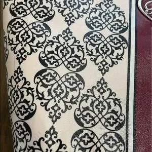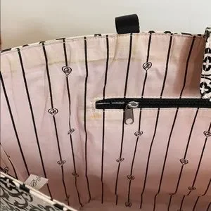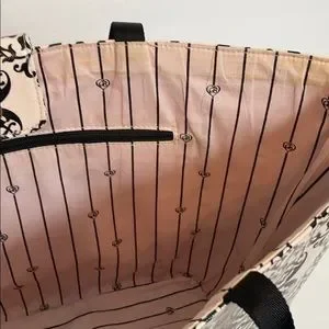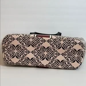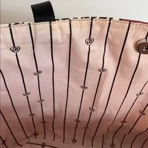 Pale pink with scroll design black hearts all over the bag. Beautiful Brighton Silver Tone Medallion in the center of the bag. There are stains on inside of bag, and some discoloration on front of tote, please see pictures, but still in great shape.