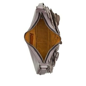 Reach for the moon with this pretty crescent-shaped bag. The sweet silhouette isn't just stellar in appearance; it's also wonderfully practical with the top zipper covering the entire length of the bag, allowing for convenient access to its contents. And with leather flower petal detail on the front, it's like carrying a little piece of Springtime where ever you go.