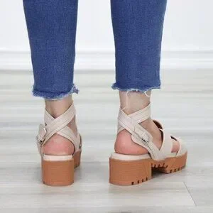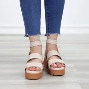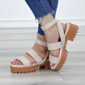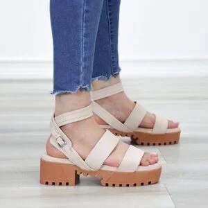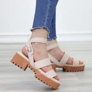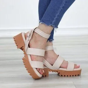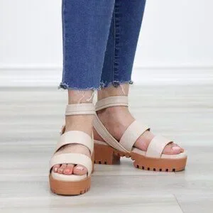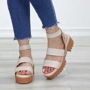 Nude Strappy Chunky Heel Sandal Faux Leather