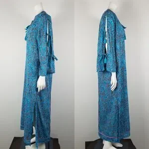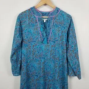 Please note this dress had a tear at the left slit that was hand-stitched, may need further repair or touch-up (seam juts out a bit at side due to repair). Sold as is, please see last photo for detail. Gorgeous blue block print, pink trim details, tassel ties at neck and on sleeves, side pockets and side slits. Please note a slip and belt are not included (there are belt loops at sides). Size XS.