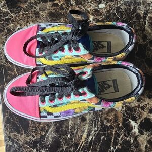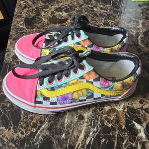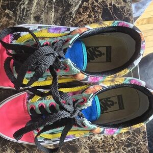 Super fun neon and floral colorway with checkerboard sole. Leather trim around the shoe opening for added strength and comfort. In good used condition. Sole is still like new. Only flaw is some wear on the top of the shoe by the laces as shown in the pictures.