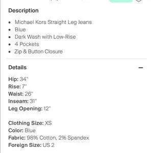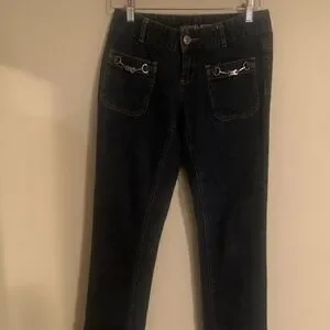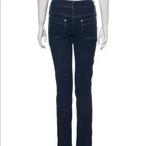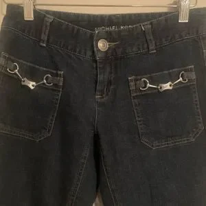 Michael Kors straight leg skinny jeans with metal embellishments. Dark blue wash.