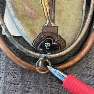 This is an original painting on a river rock of Christ On The Cross. It has metal attached and soldered on to the piece. Embellished with 3 turquoise stones. Please note in my photos that one turquoise stone is missing on the bottom of the piece. This is an original piece with the exclusive copyright attached to the back. This means that when a person creates an original work he or she automatically owns the copyright to the work.