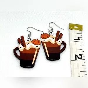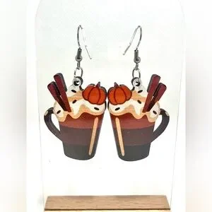 NWT Pumpkin Spice Latte Drop Dangle Earrings Lightweight Wood Fall Autumn