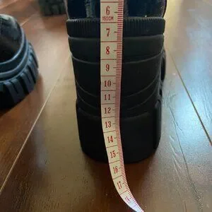 US size 9, measurements can be seen in the photos. Heel is about 10 cm (~4 inches).