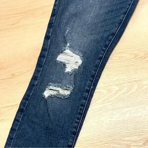 This medium High Waisted Jeggings offer their skinniest fit yet. The stretch fabric and slim construction are enhanced by a timeless blue wash, edgy destruction details, a raw cut hem, and a high-rise fit.