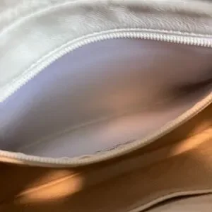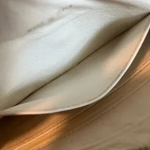 Condition: Good vintage condition. Has been professionally retouched throughout adding more longevity to this piece. Rubbing on the leather near the zipper (see picture). Minor darkening in the chain strap and zipper pull. Moderate discoloration on the fabric of the inside front pocket (see picture). Gorgeous 24k gold hardware.