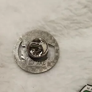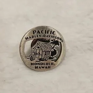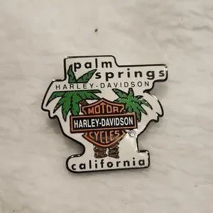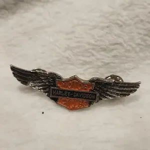 3 different Harley Davidson pins. One silver and orange wings, one from palm springs copy right, 2001 colored and one from Honolulu, Hawaii all Silver