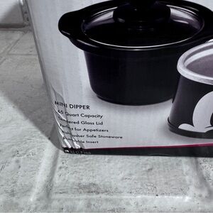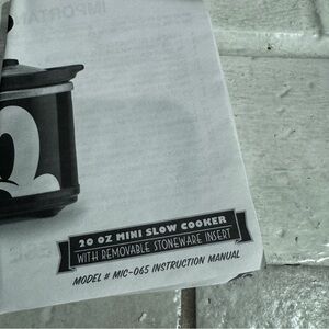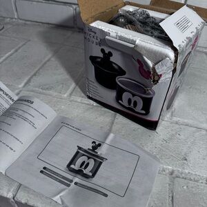 Never used, new in box, Disney’s Mickey Mouse mini slow cooker, 20 ounces. Great for appetizers and dips. The lid handle is Mickey’s head! Some box damage on upper right side as shown, but no damage to the item. .65 quarts. Please see pics for measurements. This is not a toy.