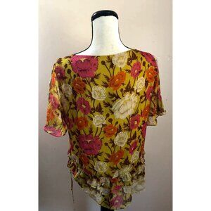 Fall floral print top with tiered ruffles at the hem and tie details at the waist. Made from delicate, semi-sheer 100% Mulberry Silk chiffon with a crinkled finish. Partially lined with polyester through the torso. Hand wash recommended. New with tags and flawless!