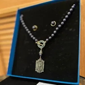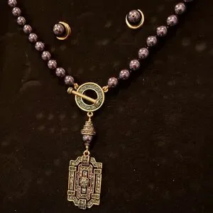This Heidi Daus set is a true masterpiece, blending vintage charm with modern elegance. The set features a stunning necklace with a unique pendant design, complemented by matching earrings. The brown, blue, and green tones and intricate details make this set a perfect choice for any special occasion.