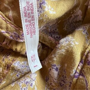 This top is beautiful and has a delicate, pretty vibe. It features a corset like style in the front with an open back and tie at the neck. Gathered 3/4 sleeves. The color base is a beautiful muted mustard color with a sweet floral pattern. The material is lightweight.