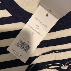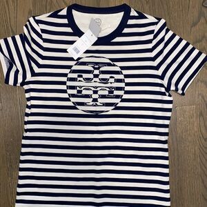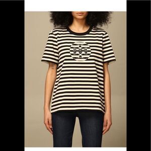 Chic black & white Tory Burch Cotton striped logo tee ✨ Soft, flattering fit with timeless Parisian vibes. Easy to dress up or down—perfect for summer skirts or denim.