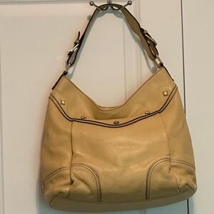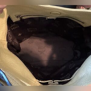 Authentic MCM Pale Yellow Pebbled Leather Studded Logo Motifs Shoulder Bag