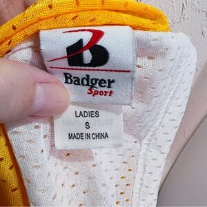 FEATURES/ACCENTS: Badger Sport Reversible Yellow and White Mesh Crew neck. Polyester. Sleeveless, Oversized fit, Tank sleeve. Red and Orange Flame Logo Print. Pull over.