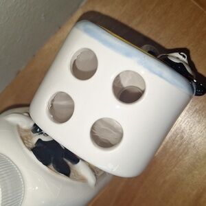 toothbrush holder and soap dispenser. (The toothbrush holder has a removable plug for easier cleaning). some small chips and crazing, but no cracks. some colorwear is also present. gdrr7087bdbh0024