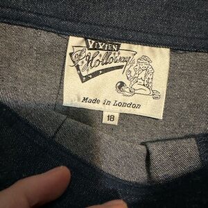 Brand new NEVER WORN Vivien of Holloway 1940s style dark denim wide leg trousers in their popular Katherine cut. Labeled UK size 18 - please see size chart screenshot included in listing, as it fits a 32 waist and 44 hips.